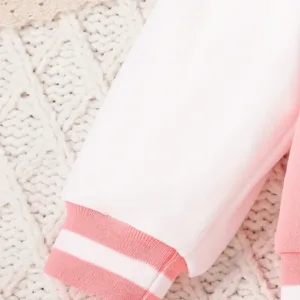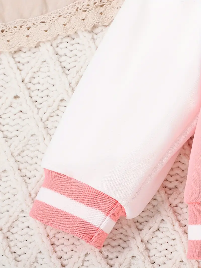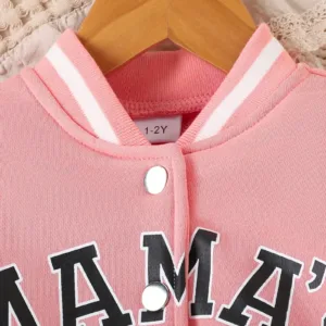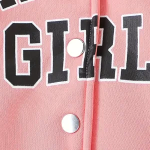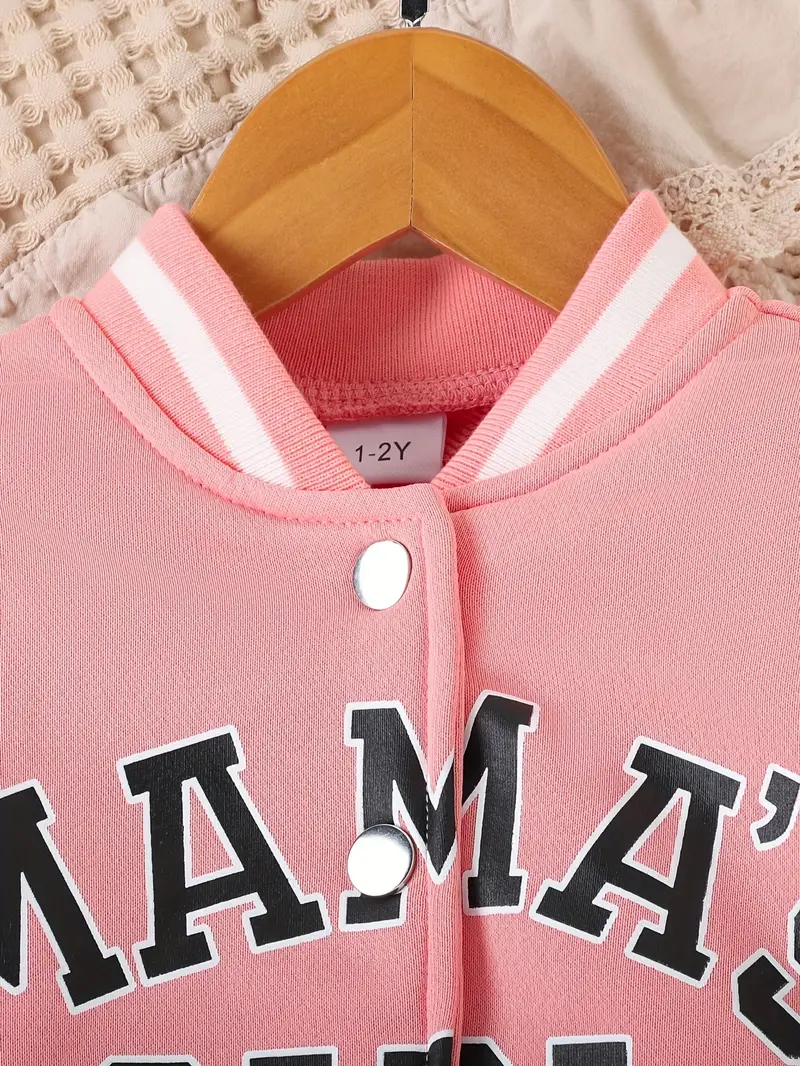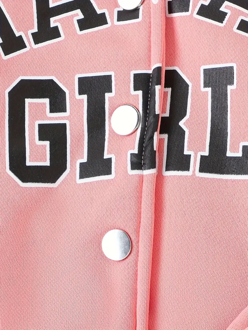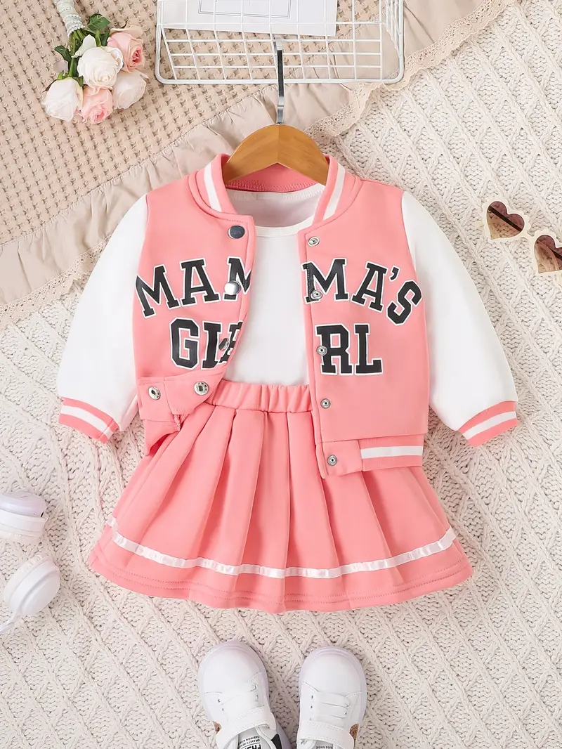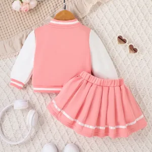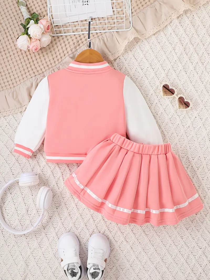 2pcs Girls’ Cotton Blend Preppy Alphabet Print Varsity Baseball Jacket & Pleated Skirt Set, Knit Fabric, Regular Long Sleeve, Button Detail, Slight Stretch, for Children Aged 12 and Under, Fall/Winter Outfit